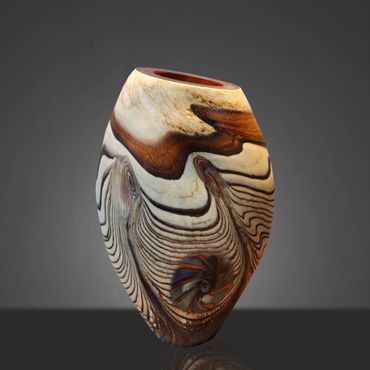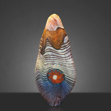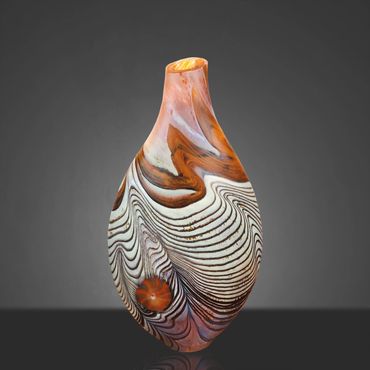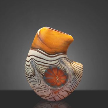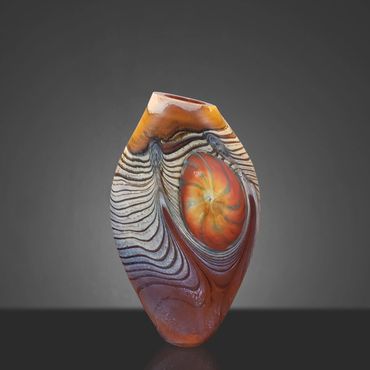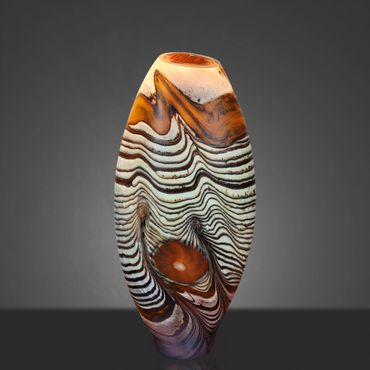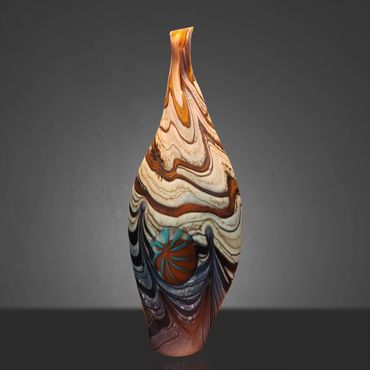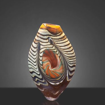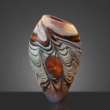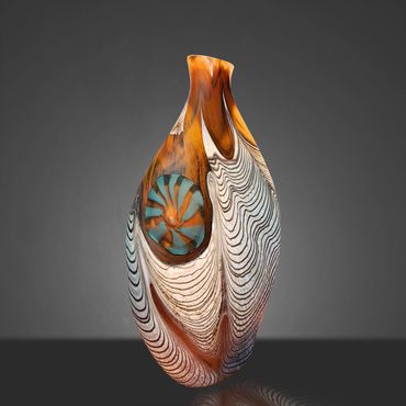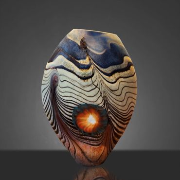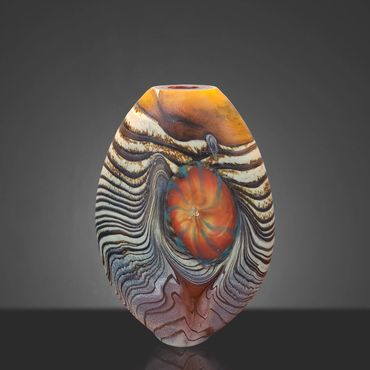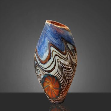 The Abstract Series developed out of the Desert Blue Series. I had started experimenting with Medallions, my adaptation of the Murrini technique. Murrini are made from multiple layers of color shaped into a rod and then, after cooling, cut into disks, which exposes the patterns of the cross section. My Medallions start in the same way but instead of cutting them, I shape them into disks while they're hot, which changes the patterns visible after inserting the Medallions into the background colors.