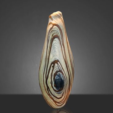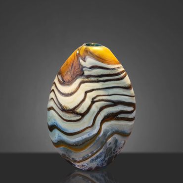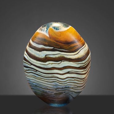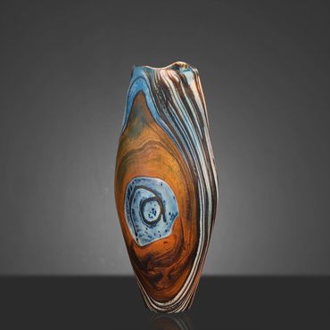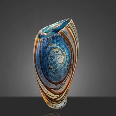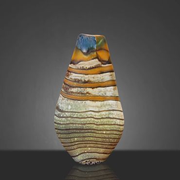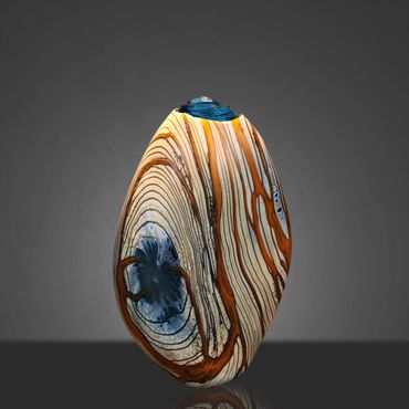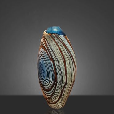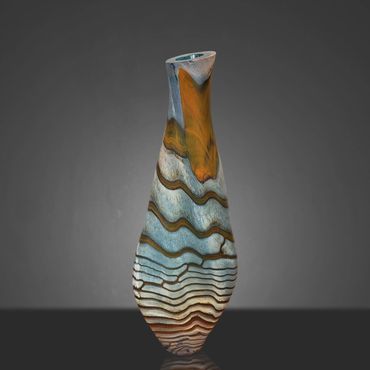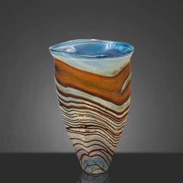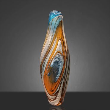 After working on a Series called Desert Collection for a while, I started replacing the white on the inside with Aqua Blue. The earthy feel of the desert colors is complimented and rendered more alive by the color and feel of water. I still use the original Desert Collection scheme, but mainly in lighting projects. The original Desert Blue series has horizontal lines, the inevitable outcome of spinning a string of glass around a ball of glass that's at the end of a blow pipe. In my mind's eye, I have seen the pieces with vertical lines for a long time and I finally decided to put in the extra work to reverse the pattern. This requires me to create an extra hole in the side of my ball after wrapping the string of orange around it. I then have to attach a second blowpipe to the new hole, break off the first pipe and close the resulting opening. After equalizing the wall thickness, which is distorted by the whole process, I can begin inflating and shaping the piece. Glassblowers refer to this process as 'Reversing the Access' and it adds between 45 minutes to an hour to the creation of the piece.